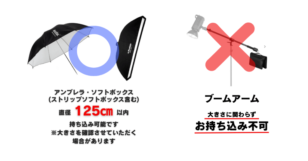 ※ブームアーム・アームスタンド等の屋外内問わず重しを必要とする機材は大きさに関わらずお持ち込みおよび使用不可