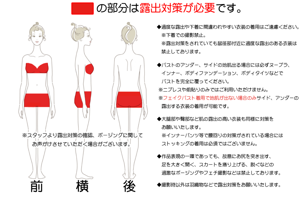- 下着や風俗系コスプレ、アダルト系など公序良俗に反する撮影及びそれらに類するグッズの持込み